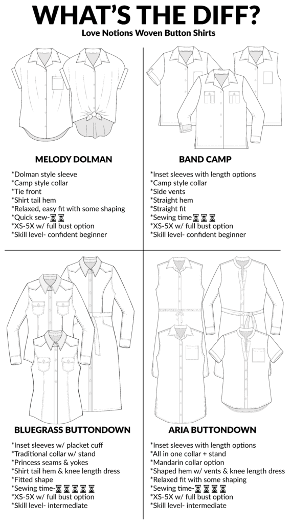 If you’ve ever browsed our pattern collection and wondered which woven button shirt pattern is right for you, you’re not alone! From quick sews to more detailed makes, Love Notions has four woven button-down options to suit every style, skill level, and sewing mood.