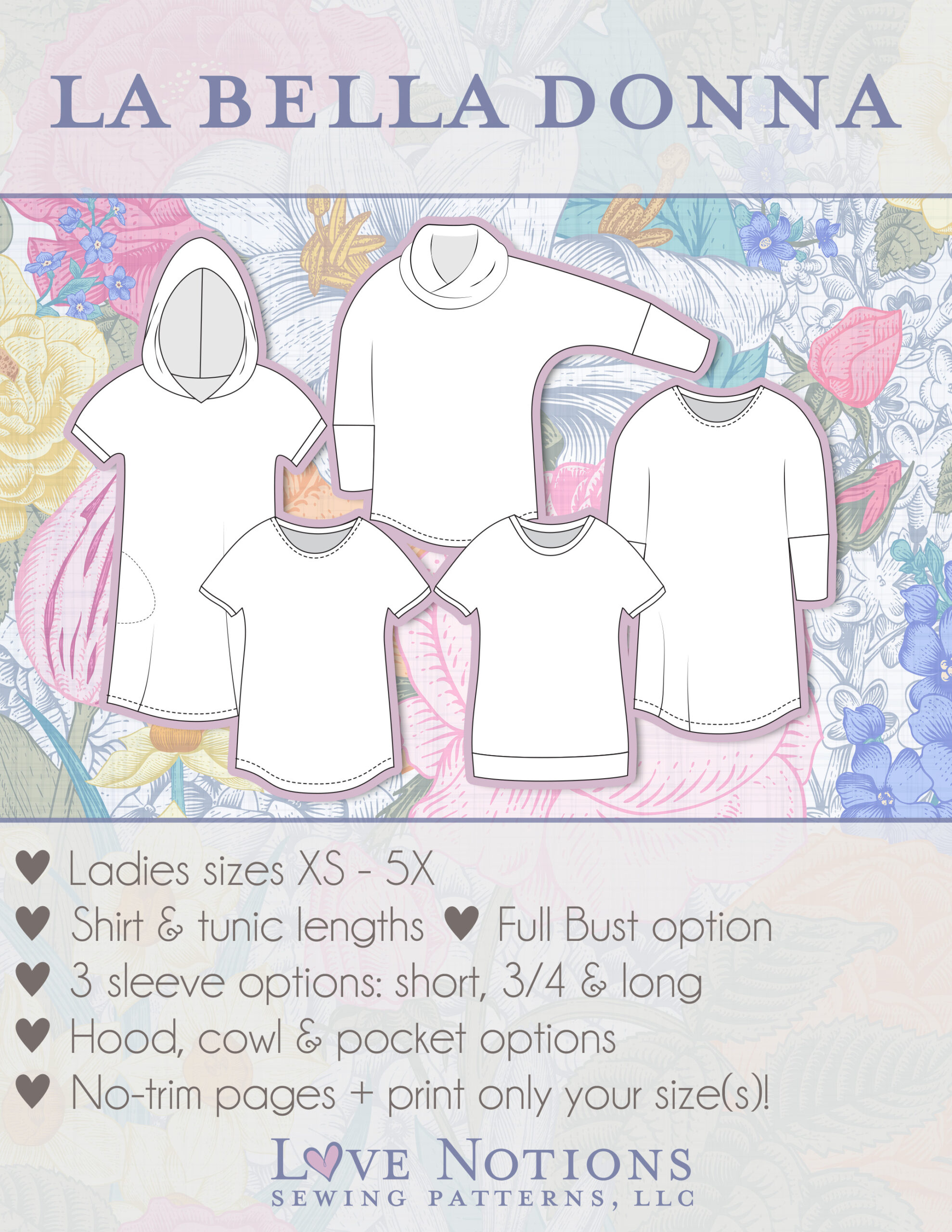 The La Bella Donna is such an easy sew that has so many options! This will be a staple as a go-to pattern for all the seasons. I have made a tunic length with a cowl and it sewed up so quickly because of the Dolman design and the easy-to-follow instructions. Another great pattern to add to my collection that will be used time and again. Thank you LN!