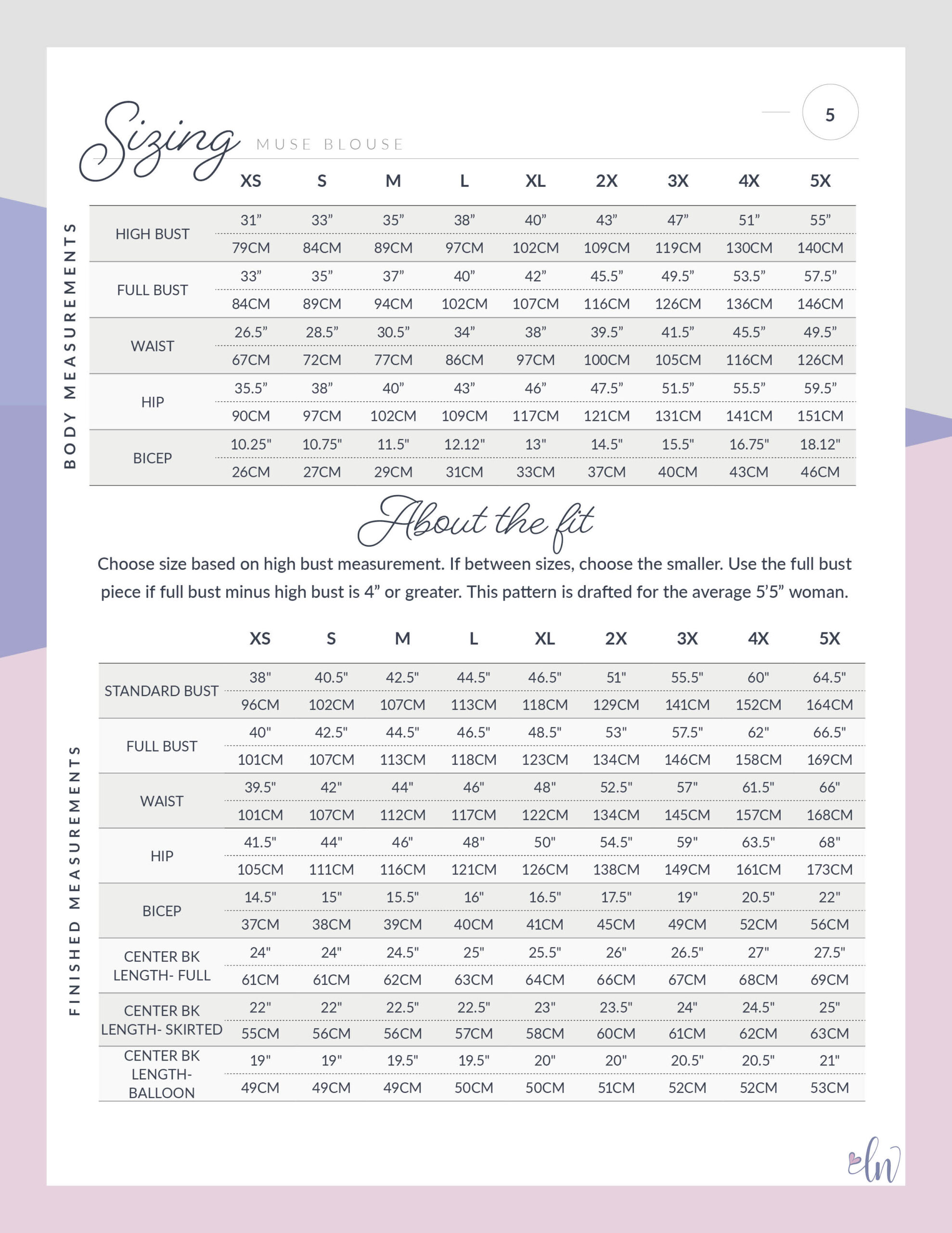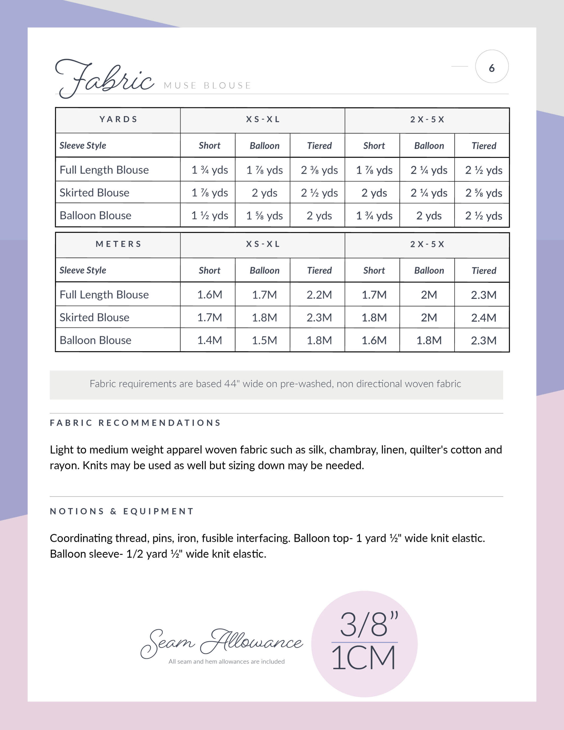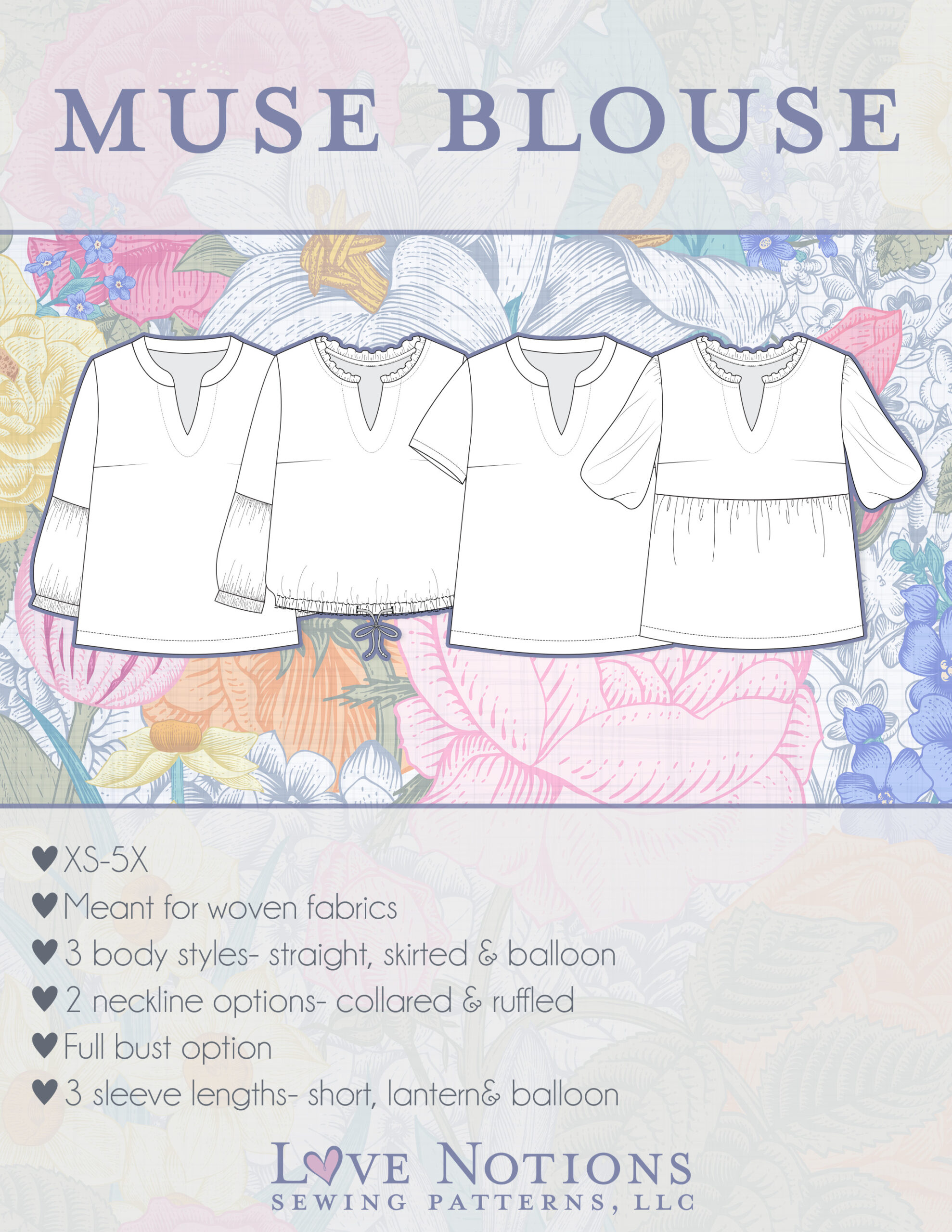 The Muse Blouse is a woven blouse with three different body views: straight, skirted and balloon hem with a drawstring. Three fun sleeve styles are also included: short, lantern and balloon. The neckline of this blouse is finished with a classic banded collar or a ruffle with a faced V neckline. Sew this blouse up in your favorite quilters cotton, chambray, linen, rayon or even silk. This is a great transitional top with so many options! Ladies sizes XS-5X with a full bust option.