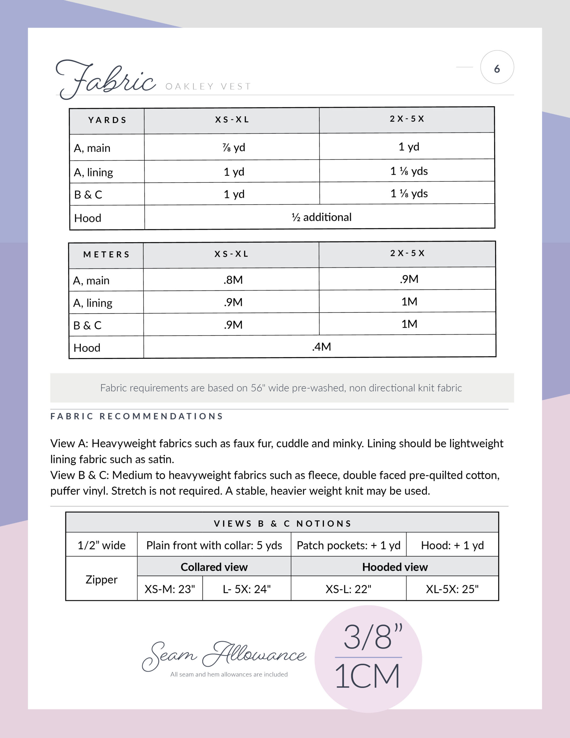 Every fall and winter wardrobe needs a vest! The Oakley Vest gives you three different looks. View A is an open front vest meant for fun fabrics like faux fur and minky. It can be lined and includes in-seam pockets. View B features a separating zipper, bias binding trim and patch pockets. View C also features a separating zipper, bias binding trim as well as princess seams and inset pockets. View B & C can choose from a collar or a hood to finish the look. All views have gentle shaping at the side seams as well as a deeper curved front hem to give a more feminine look.