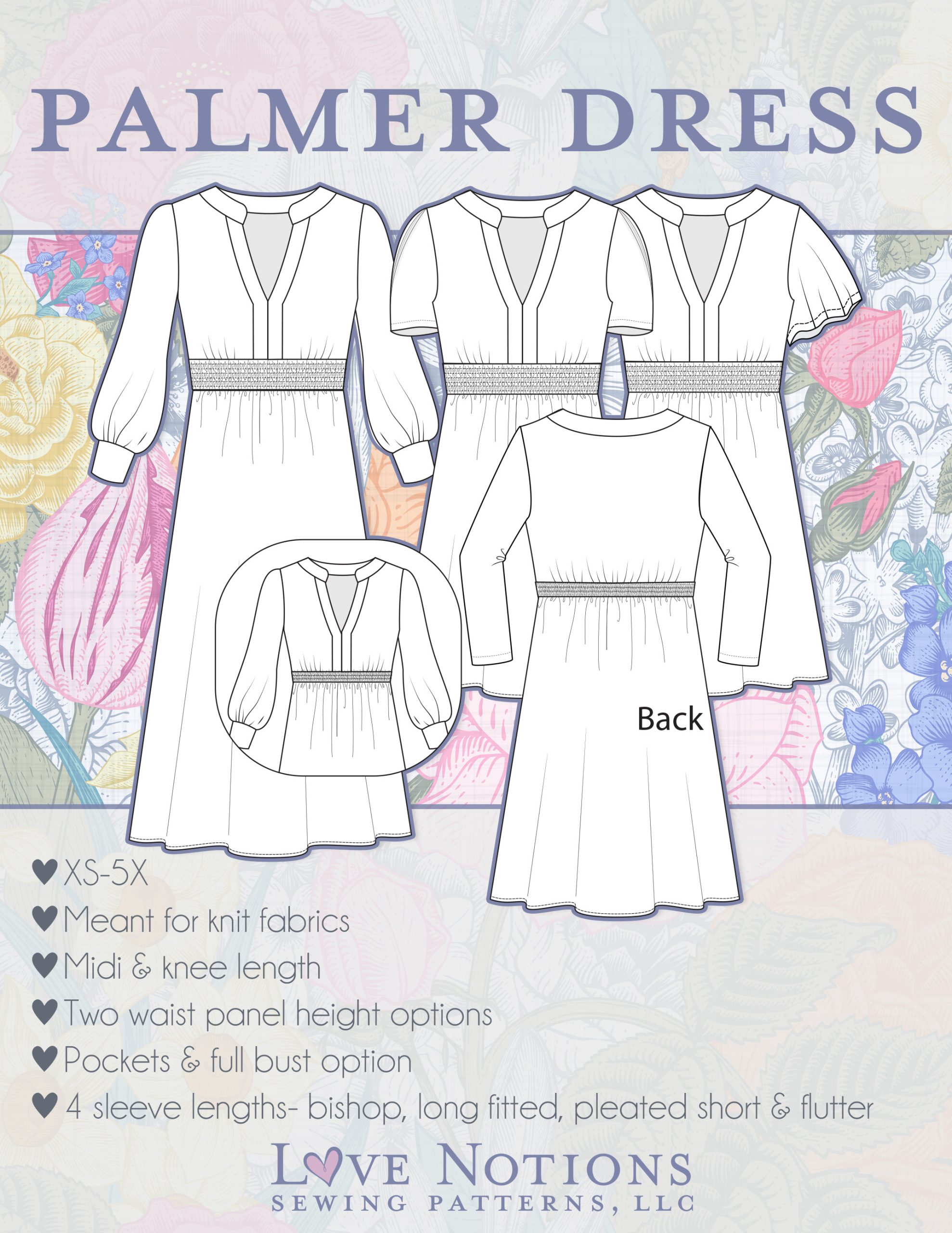 The Palmer Dress is a knit-focused sewing pattern available in sizes XS–5X, featuring a structured V-notch neckline and a waist panel constructed with elastic channels for consistent shaping and comfort. The pattern includes midi and knee length options, two waist panel heights, inseam pockets, and a full bust piece for improved fit. Sleeve views include bishop, long fitted, pleated short, and flutter, giving makers flexibility across seasons and styles. Palmer offers a clean, well-proportioned silhouette with construction techniques that are accessible for confident beginners and satisfying for experienced sewists.